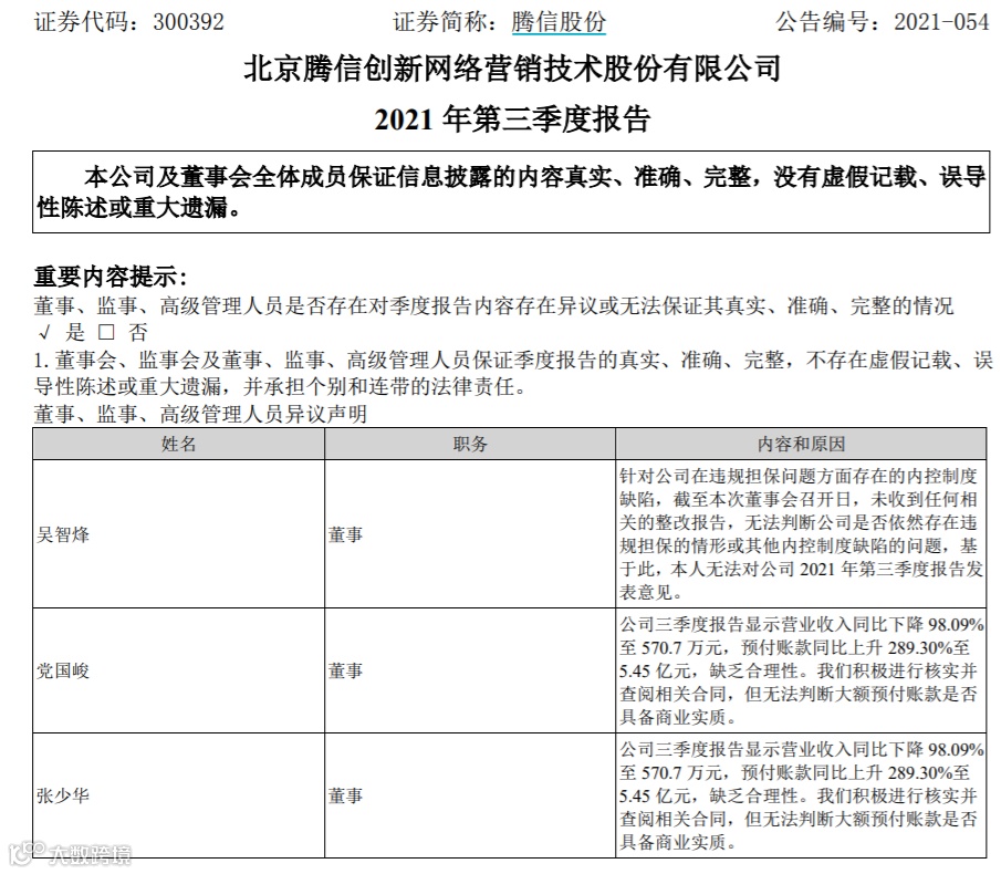 在当日的公司董事会会议上,腾信股份董事吴智烽、党国峻、张少华对公司三季报投弃权票,其中张少华自2021年1月以来担任公司财务负责人。