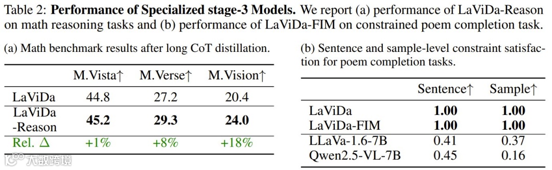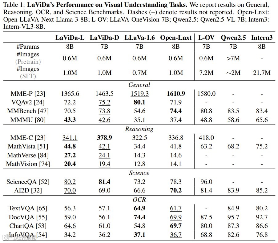 在关键性能指标上,LaViDa展现出对传统自回归模型的全面竞争力。在视觉-语言理解基准MMMU中,以LLaDA-8B为基座的LaViDa-L以43.3分拔得头筹,超越包括LLaVA在内的所有同类型模型;在科学问答任务ScienceQA上,LaViDa-L和LaViDa-D分别以81.4%和80.2%的准确率刷新纪录,尤其在复杂图表解析场景中,其双向推理能力使空间关系和逻辑链条的捕捉更加精准。值得关注的是,在数学推理数据集MathVision上,经过CoT蒸馏的LaViDa-Reason实现了18%的性能跃升,显著优于未优化的基线模型,证明了扩散架构在逻辑推导任务中的潜力。