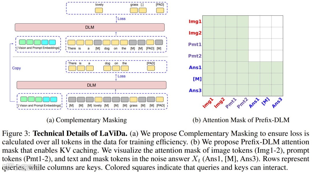 语言处理端,LaViDa采用非因果注意力机制的扩散语言模型(DLM),彻底摒弃了自回归模型的单向生成模式。不同于逐字预测下一个token的目标,扩散模型将文本生成视为去噪过程:在训练阶段,通过前向扩散逐步将真实文本序列转化为掩码序列,推理时则从随机掩码序列出发,通过反向过程逐层恢复有意义的文本。这种双向建模能力使LaViDa能够同时处理上下文依赖,尤其擅长需要全局结构约束的任务——例如生成指定格式的JSON、填充诗歌的押韵段落,或根据图像内容补全结构化表格。实验显示,这种架构在处理需要跨位置协同的文本生成时,稳定性比自回归模型提升超过60%。