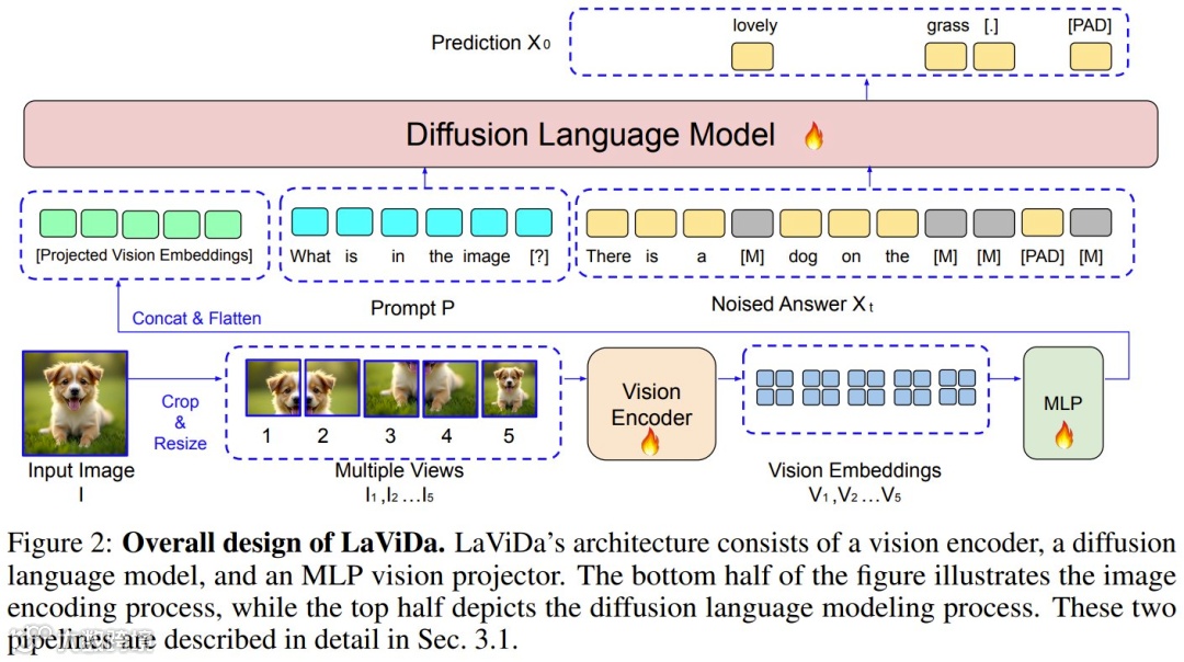 LaViDa的核心设计巧妙融合了视觉感知与扩散生成的优势。在视觉处理端,模型采用多视图编码策略:将输入图像Resize为768²后,分割为四个384²的局部视图和一个384²的全局视图,通过SigLIP-400M视觉编码器独立处理每个视图,生成总计3645个视觉嵌入。为平衡计算效率与信息密度,研究团队对每个视图进行2×2平均池化,将嵌入数量压缩至980个,再通过MLP投射网络与语言模型对接。这种多尺度视觉特征提取方式,既保留了图像的全局语义,又捕捉了局部细节,为后续的跨模态交互奠定了基础。