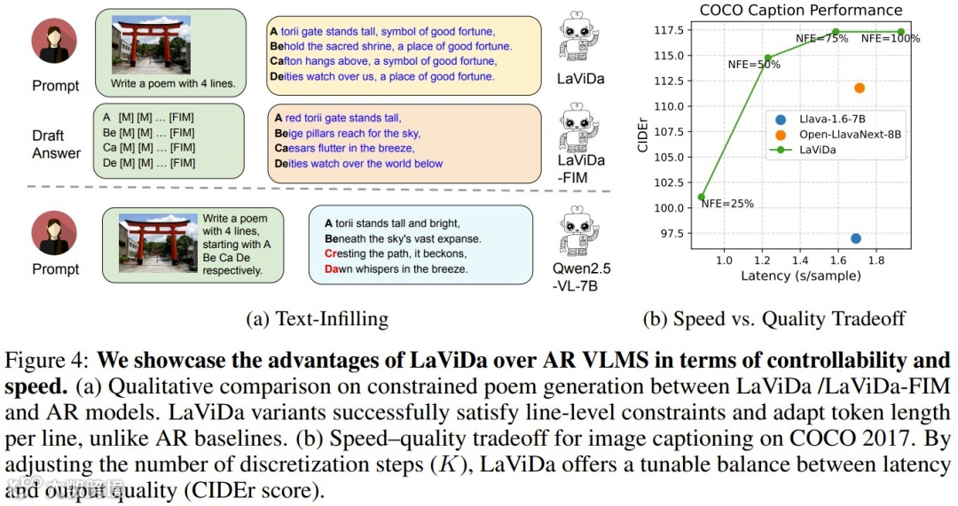 速度与质量的动态平衡是扩散模型的天然优势,LaViDa将这一特性在多模态场景中发挥得淋漓尽致。通过调整扩散步数(NFE),模型可在生成效率与输出质量间灵活切换:当NFE设置为50%时,处理速度较自回归基线提升30%,同时保持CIDEr分数(图像描述评估指标)持平;即使NFE降至25%,速度提升至2倍以上时,性能仅下降约5%。这种“按需调节”的特性,使其在实时对话、大规模内容生成等对延迟敏感的场景中具备显著优势——例如,在电商平台的商品图自动描述系统中,可根据流量峰值动态调整生成策略,兼顾用户体验与计算成本。