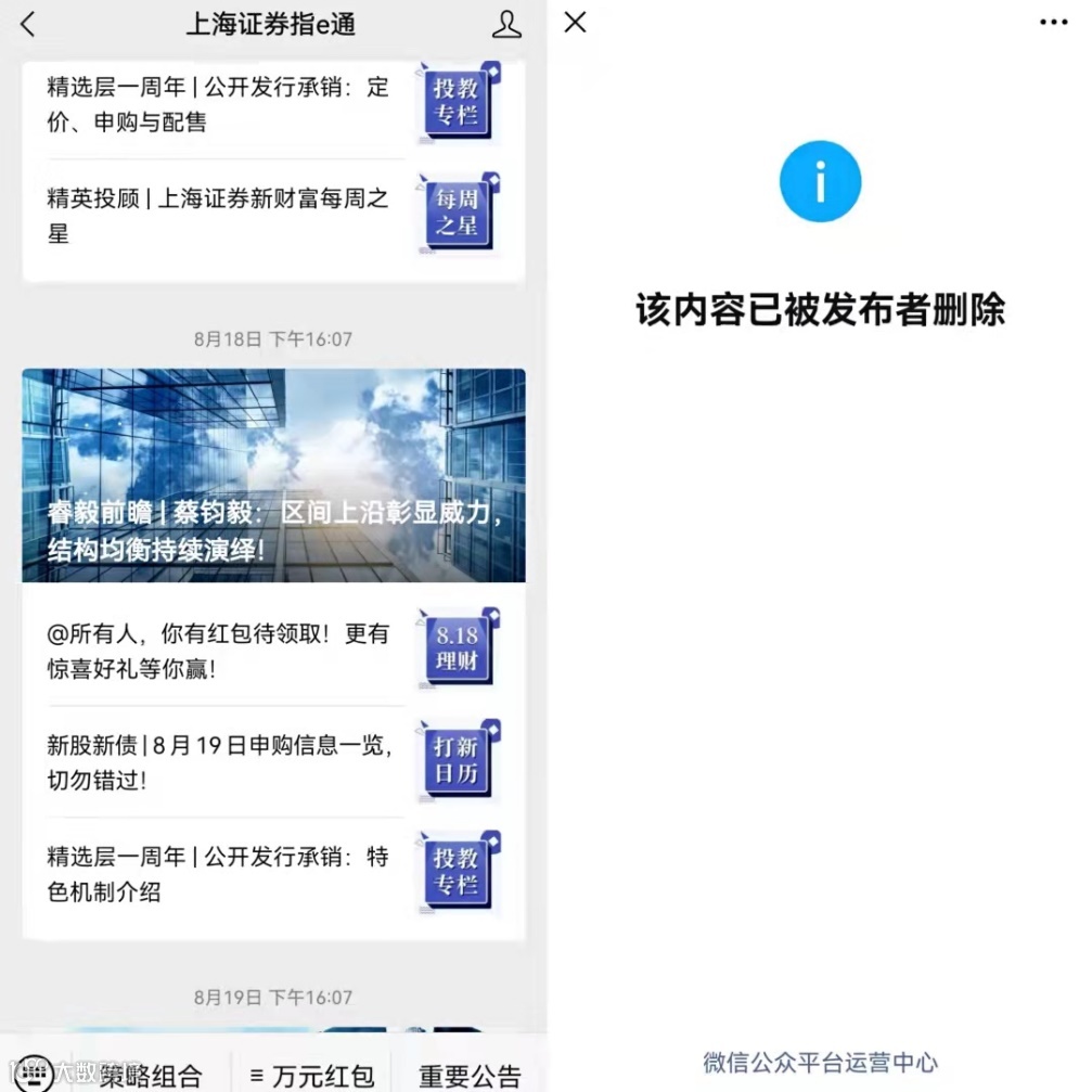 在上海证券的官方微信公众号中,蔡钧毅最近一次发表观点《蔡钧毅:区间上沿彰显威力,结构均衡持续演绎》是在2021年8月18日,不过该文章目前已被删除。