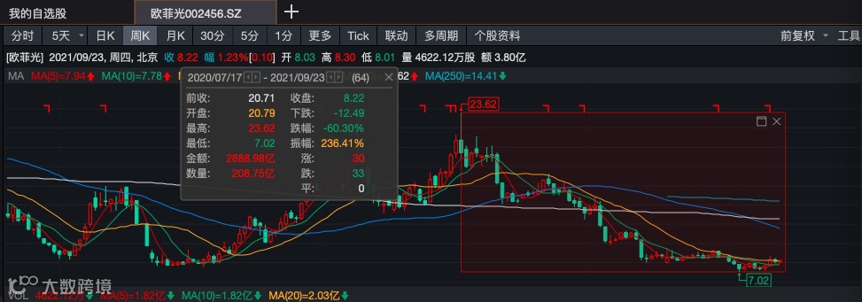 股价方面,在去年7月欧菲光参股公司被美国列入实体清单后,公司股价就接连下挫。截至今年10月13日,公司股价收于8.11元/股,较2020年的最高点23.62元/股累计下跌超60%,总市值264亿元。