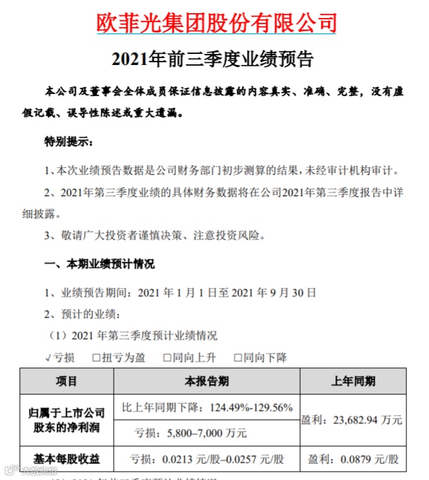 欧菲光公告称,公司预计2021年第三季度净利润亏损5800万元-7000万元,上年同期盈利2.37亿元。预计前三季度亏损2400万元-3600万元,上年同期盈利7.39亿元。