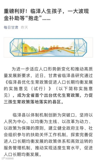 甘肃省临泽县近日出台《临泽县优化生育政策促进人口长期均衡发展的实施意见(试行)》(简称《意见》)。
