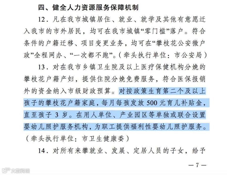 7月28日,四川省攀枝花市发布《关于促进人力资源聚集的十六条政策措施》,其中提及对2021年6月12日及以后生育二、三孩的攀枝花户籍家庭,每月每孩发放500元育儿补贴金,直至孩子3岁。