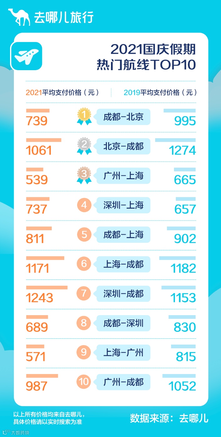 此外,机票价格更便宜了。去哪儿数据显示,今年国庆期间,成都-北京、北京-海口、长沙-西宁、贵阳-北京、上海-广州等多条热门探亲、旅游航线的机票平均支付价格比2019年国庆假期便宜三成左右。成都-北京是去哪儿平台国庆假期预订热度最高的航线,平均支付价格仅为739元,预订热度比2019年同期增长1.3倍、价格却便宜了256元。