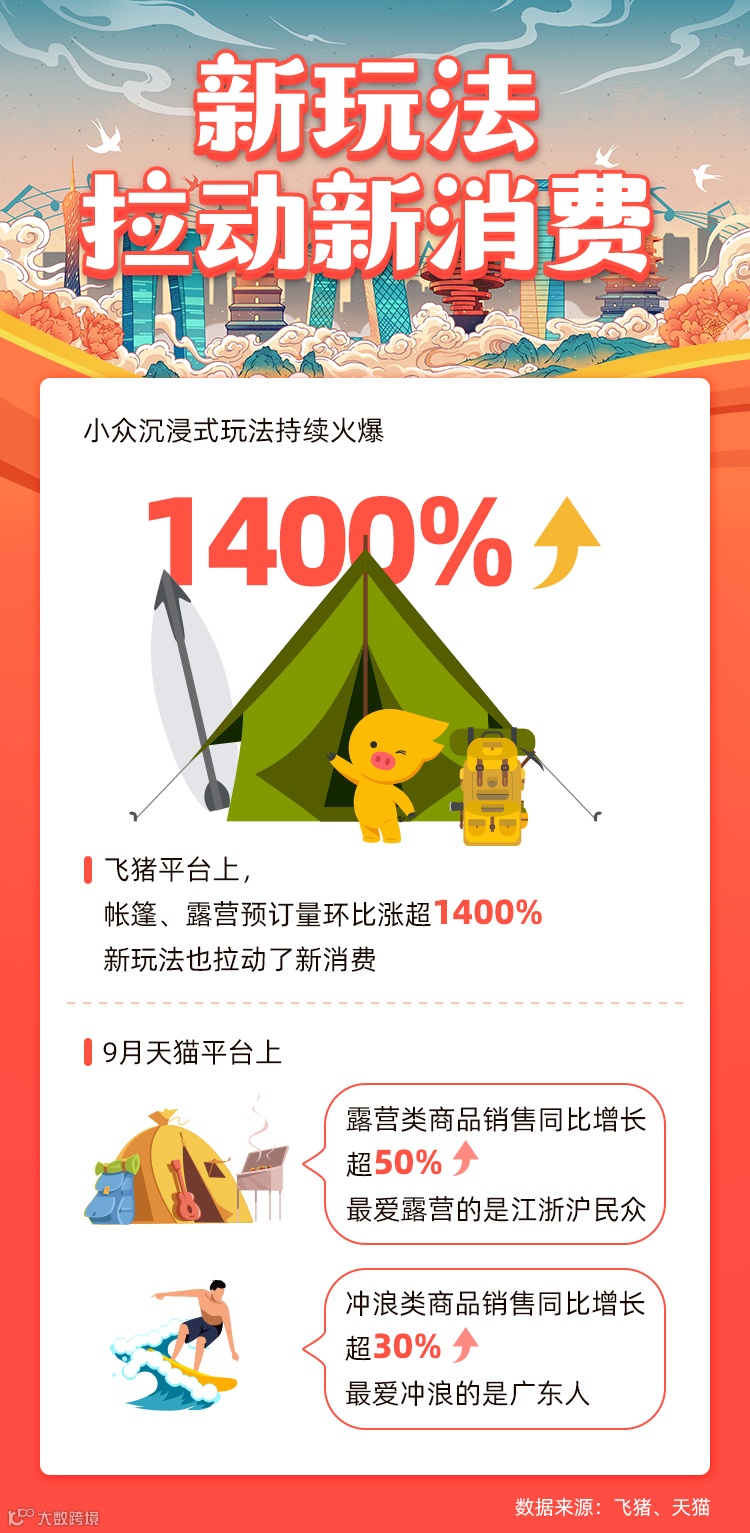 天猫平台数据显示,9月平台上自驾游带动车载电饭煲销量环比增长近20%;露营类、冲浪类、垂钓类商品销售分别同比增长超50%、30%和20%;天猫国际平台上,进口骑行装备销售同比增长超170%,进口露营用品同比增长近130%;其中最爱露营的是江浙沪人,最爱冲浪的是广东人,湖南人湖北人爱垂钓。