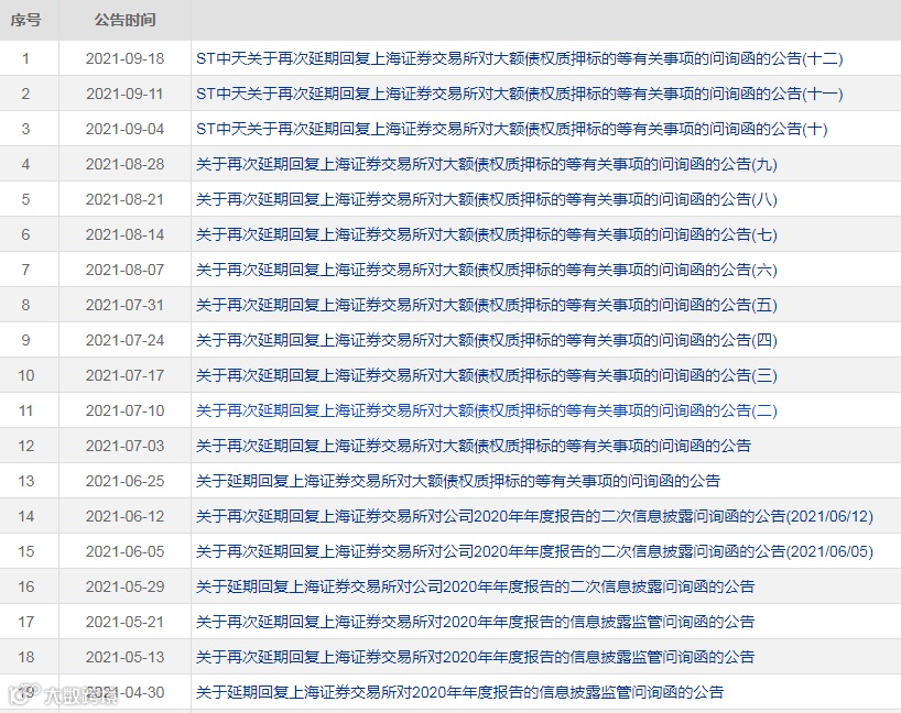 针对监管部门的问询函,ST中天也是一再延迟回复,东方财富choice数据显示,今年以来,ST中天竟发布了19次延期回复的公告。