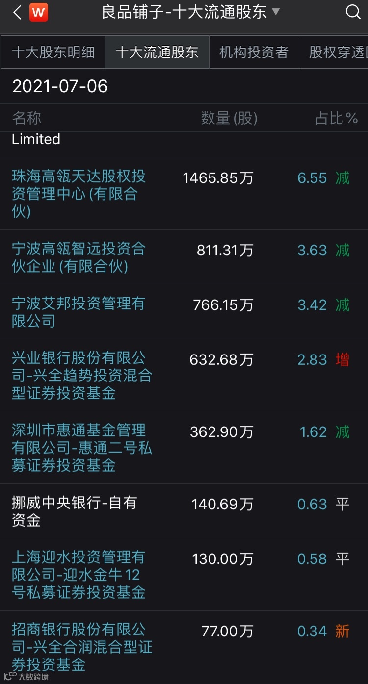 截至6月30日,兴全合润基金规模为320.54亿元,基金经理为谢治宇。二季度末,兴全合润并未在良品铺子十大流通股东之列。截至7月6日,兴全合润持有良品铺子77.00万股,成为新进第十大流通股东。