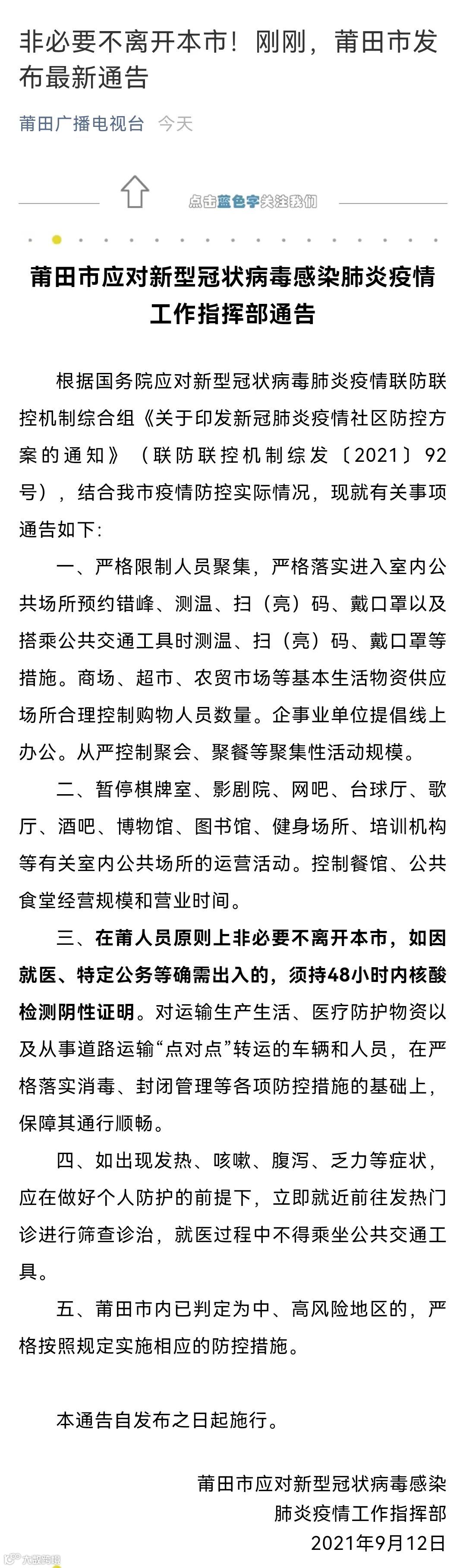 9月12日,莆田市应对新型冠状病毒感染肺炎疫情工作指挥部发布通告,要求在莆人员原则上非必要不离开本市。如因就医、特定公务等确需出入的,须持48小时内核酸检测阴性证明。