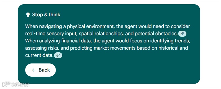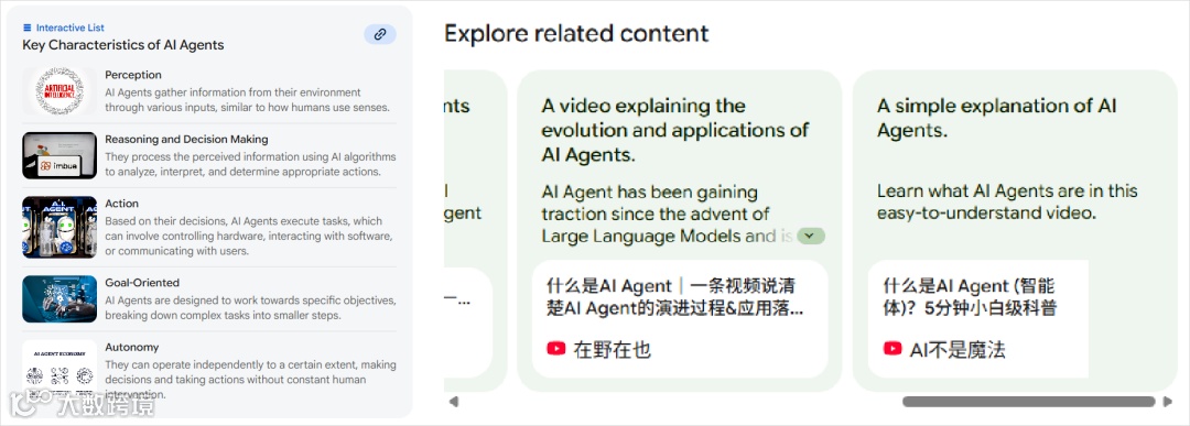 以学习“Agent”概念为例,首先在界面左侧呈现知识框架,涵盖定义、目的、特征等要点,右侧展示具体知识内容,方便用户先构建整体认知,再深入学习细节;具体知识以图文结合的卡片式笔记呈现,附带相关探索链接,确保知识学习全面无遗漏;