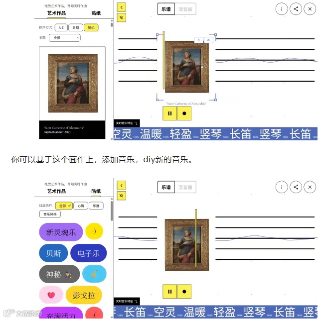 National Gallery Mixtape在艺术与音乐的跨界融合上颇具新意。其核心功能是依据用户上传的画作,自动生成与之匹配的配乐,并明确配乐使用的乐器种类与风格,用户还能在此基础上进行个性化创作。