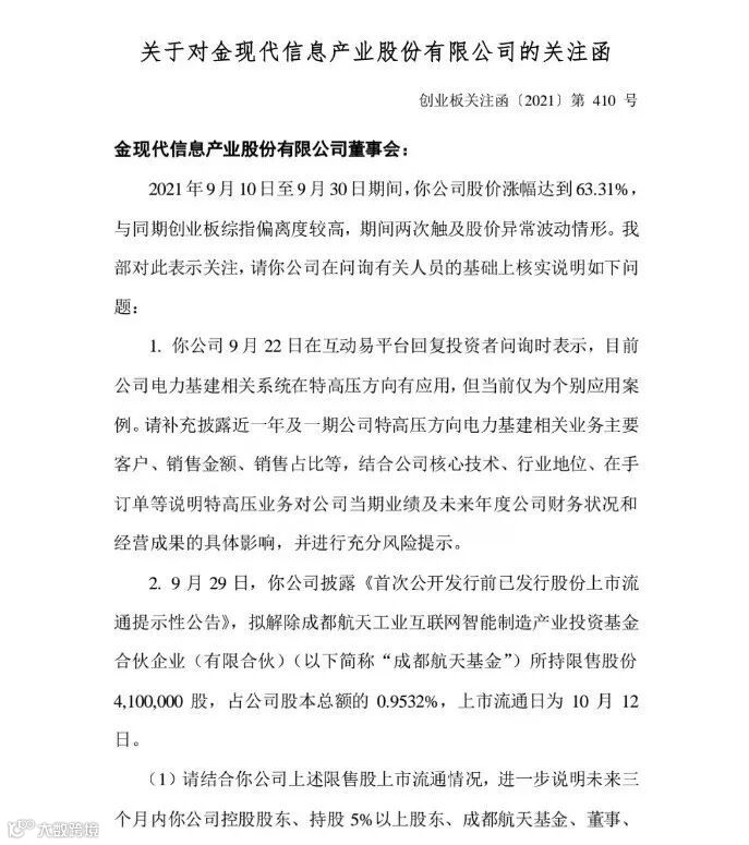 10月2日,深交所下发《关于对金现代信息产业股份有限公司的关注函》。关注函指出,9月10日至30日期间,金现代股价涨幅达到63.31%,与同期创业板综指偏离度较高,期间两次触及股价异常波动情形。