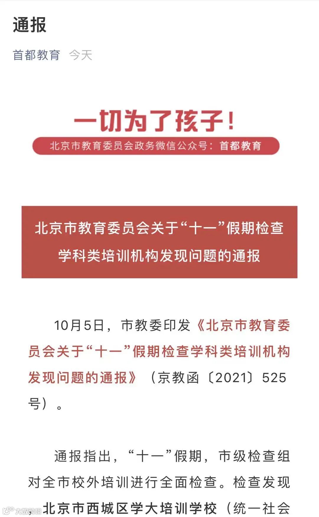 10月5日,北京市教委通过官微“首都教育”发布《北京市教育委员会关于"十一"假期检查学科类培训机构发现问题的通报》指出,"十一"假期,市级检查组对全市校外培训进行全面检查。检查发现, 北京市西城区学大培训学校存在节假日组织开展学科类培训的问题。