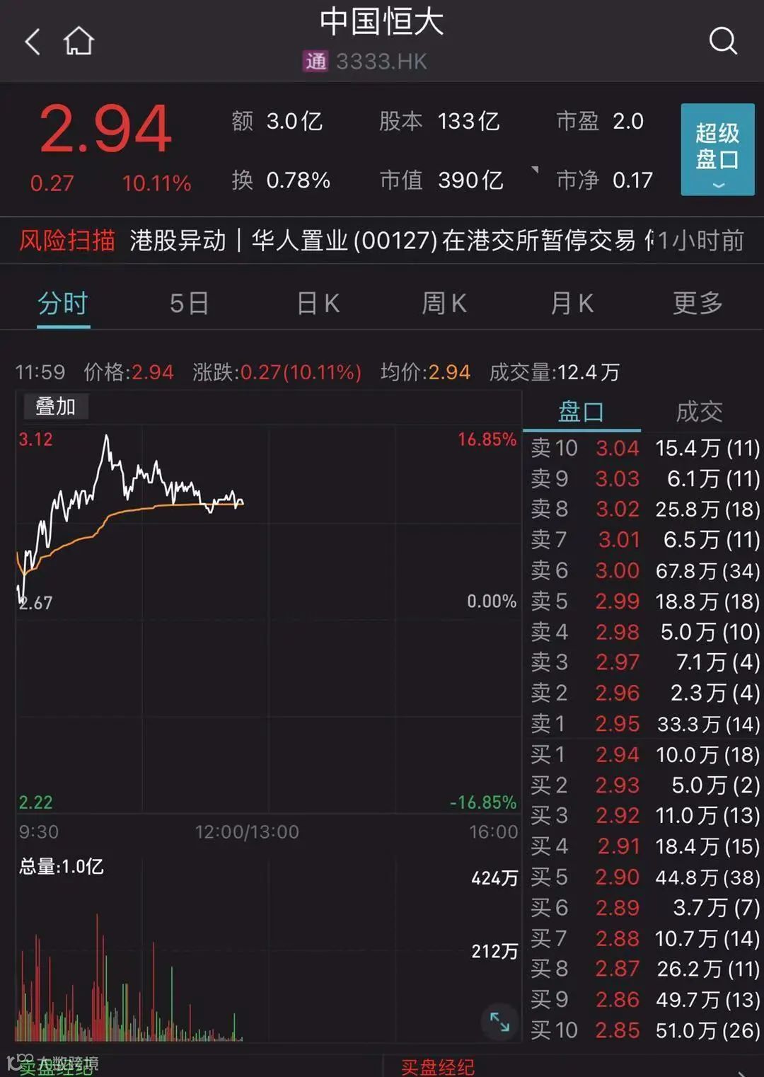 受此影响,9月29日早盘,恒大系股价大幅上涨,中国恒大、恒大汽车、恒大物业早盘盘中涨幅均超过10%。其中,中国恒大早盘最高涨幅超过16% ,市值接近400亿港元。