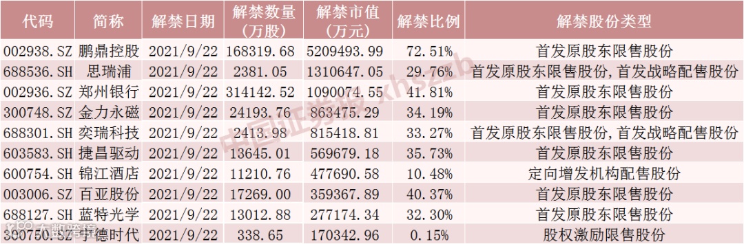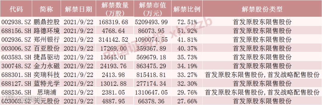 具体来看,Wind数据显示,鹏鼎控股9月22日将解禁16.83亿股,均为首发原股东限售股份。思瑞浦9月22日将解禁2381.05万股,为首发原股东限售股份和首发战略配售股份。郑州银行9月22日将解禁31.41亿股,均为首发原股东限售股份。