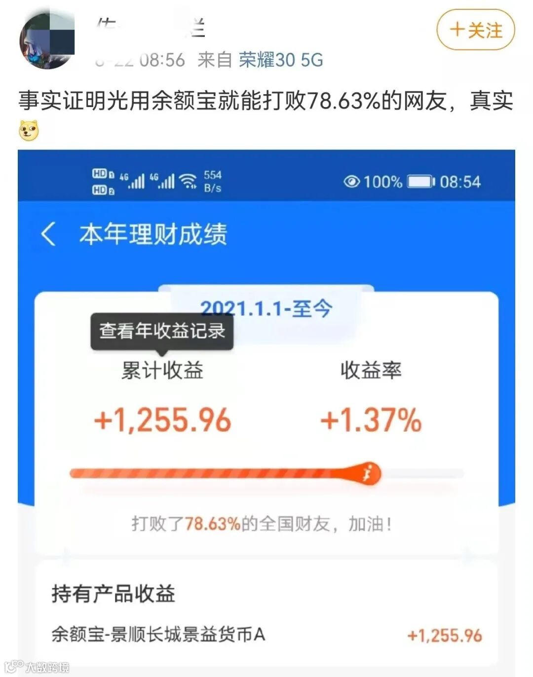 还有人在微博上调侃:“满仓余额宝,就打败了78.63%的网友”。
