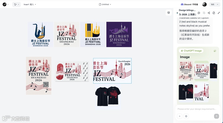 实测过程中,Lovart展现出惊人的专业素养。当用户输入需求后,界面从传统聊天框切换为左侧画布、右侧对话的双栏布局,所有生成结果实时呈现,支持自由拖动缩放,仿佛一个可视化的创意工作台。