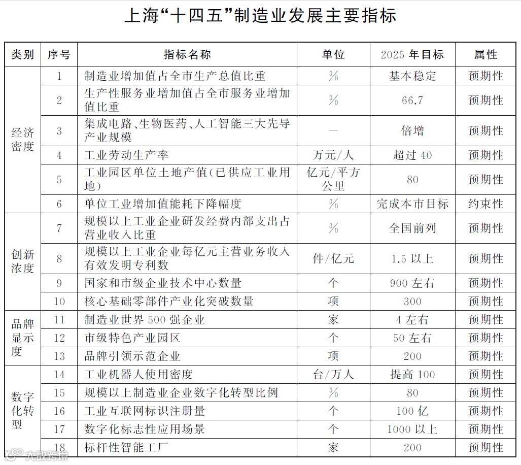 同时,《规划》还从经济密度、创新浓度、品牌显示度、数字化转型等4个维度,提出了18项具体指标。比如,保持制造业增加值占全市生产总值比重基本稳定,夯实实体经济发展的根基;核心基础零部件产业化突破数量达到300项,努力攻克一批关键核心技术;力争工业投资规模累计达到8500亿元左右,累计完成技术改造投资5200亿元以上;集成电路、生物医药、人工智能三大先导产业要力争实现规模倍增;培育品牌引领示范企业200家,打响“上海制造”的名企品牌;培育“专精特新”企业5000家左右,其中专精特新“小巨人”企业300家左右,制造业单项冠军企业30家左右;工业机器人使用密度提高100台/万人,提升制造业智能化、数字化水平等。