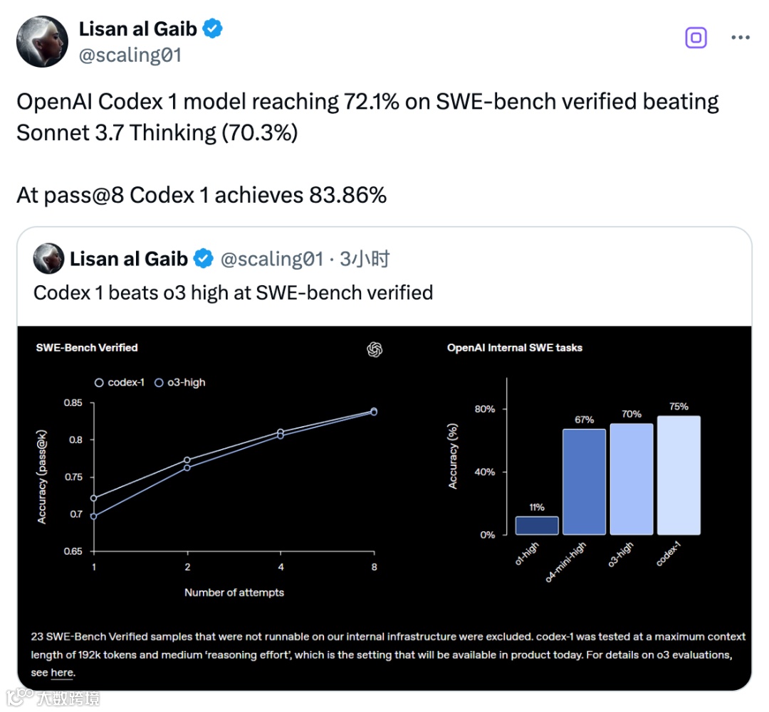 支撑这一能力的核心是专为软件工程场景微调的模型 codex-1,作为 OpenAI o3 系列的重要分支,它在权威基准测试 SWE-Bench 中取得 72.1% 的得分,超越同期竞品 Claude 3.7 和 o3-high。不同于传统代码生成工具依赖静态规则库或单一任务训练,codex-1 的「实战派」训练方式使其具备独特优势:通过在真实开发环境中进行强化学习,模型生成的代码不仅符合人类工程师的编码习惯,更能严格遵循项目规范,自动运行测试用例直至通过,显著减少人工审查成本。这种「从实践中学习」的机制,让 Codex 能够理解代码背后的业务逻辑,而非简单堆砌语法正确的代码片段。