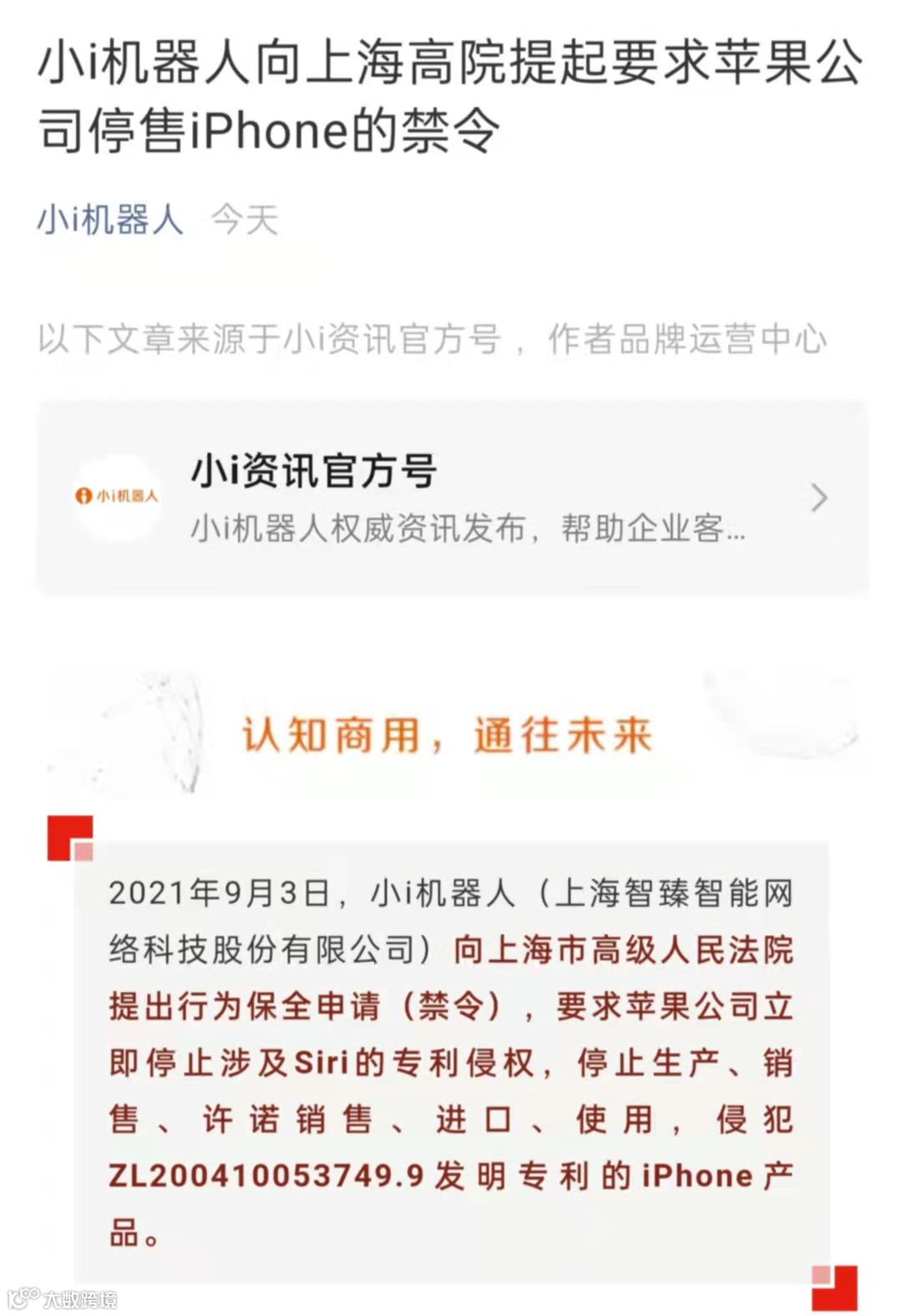 小i机器人称,2021年9月3日,小i机器人(上海智臻智能网络科技股份有限公司)向上海市高级人民法院提出行为保全申请(禁令),要求苹果公司立即停止涉及Siri的专利侵权,停止生产、销售、许诺销售、进口、使用,侵犯ZL200410053749.9发明专利的iPhone产品。