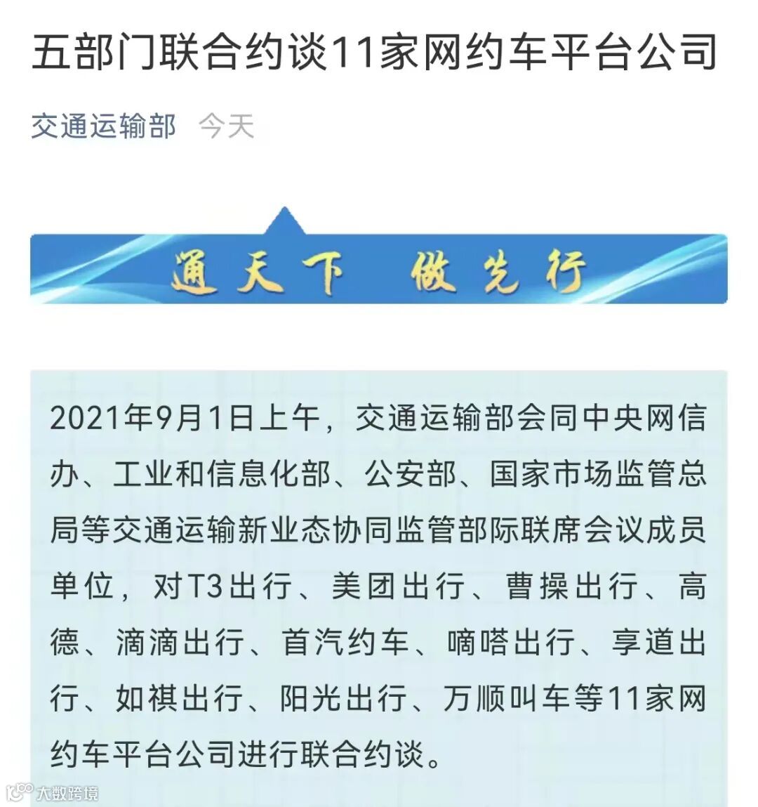 据交通运输部9月2日消息,9月1日上午,交通运输部会同中央网信办、工业和信息化部、公安部、国家市场监管总局等交通运输新业态协同监管部际联席会议成员单位,对T3出行、美团出行、曹操出行、高德、滴滴出行、首汽约车、嘀嗒出行、享道出行、如祺出行、阳光出行、万顺叫车等11家网约车平台公司进行联合约谈。