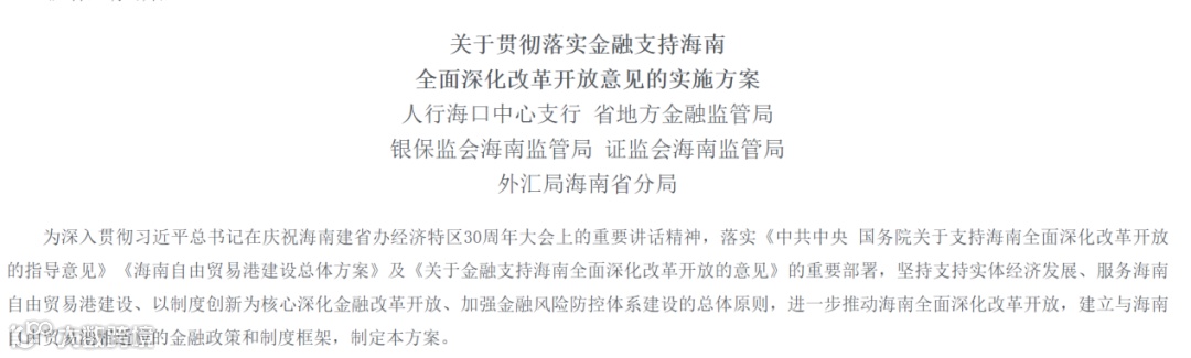 9月1日,海南省人民政府办公厅转发人行海口中心支行、省地方金融监管局、银保监会海南监管局、证监会海南监管局、外汇局海南省分局《关于贯彻落实金融支持海南全面深化改革开放意见的实施方案》的通知。