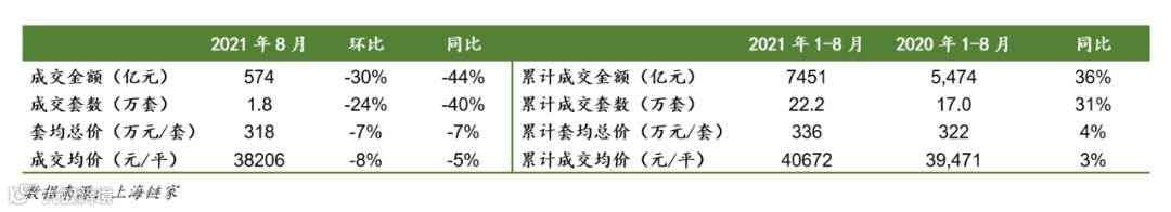 据上海链家研究院监控数据显示,8月份上海全市共成交二手房1.8万套,环比下降24%,同比下降40%,成交金额574亿元,环比下降30%,同比下降44%;套均总价318万元/套,环比和同比均下降7%;成交均价38206元/平,环比下降8%,同比下降5%。