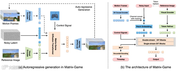 其次是“图像到世界”生成框架的构建,这一技术让视觉信号承载起空间智能的重任。Matrix-Game主模型采用基于扩散模型的独特架构,突破性地摆脱了对语言提示的依赖。只需一张参考图像作为起点,模型便能基于视觉信号建模空间几何、物体运动与物理交互:当用户按下“前进”键,模型不仅生成角色移动的画面,更会同步计算地形高度变化、碰撞体积交互,甚至树叶摆动的物理反馈;鼠标转动视角时,天空光照角度、远处景物的透视关系也会实时调整。这种对空间智能的深度建模,使得生成的虚拟世界具备“内在合理性”——角色跳跃后会自然落地,物体被击打会遵循动量守恒,雨滴会在水面激起涟漪,而非机械重复预设动画。为实现长视频的连贯生成,模型采用自回归技术,以前5帧画面作为运动上下文逐段扩展,同时通过随机扰动、CFG引导等策略抑制时序漂移,确保数分钟的连续交互中,场景光照、物体位置始终保持逻辑一致,形成一个随用户行为持续演进的有机整体。