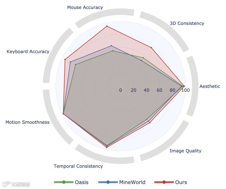 与国际前沿方案如英伟达Cosmos、谷歌DeepMind的世界模型,以及开源竞品Oasis、MineWorld相比,Matrix-Game展现出显著的差异化优势。在交互控制层面,它实现了从“模糊响应”到“精准操控”的跨越。Decart的Oasis模型常因画面模糊、逻辑断层被用户诟病,而Matrix-Game支持12种基础交互指令,键盘控制准确率达95%,鼠标视角切换延迟低于50ms。其独特的多模态Diffusion Transformer架构,将离散的键盘指令与连续的鼠标坐标变化统一编码,使模型能精准处理不同类型的输入信号,生成与操作意图高度匹配的画面。在场景泛化能力上,Matrix-Game突破了“单一风格”的局限,通过融合Minecraft的方块地形、Unreal Engine的写实场景等多元数据,实现了从沙漠雪地到幻想世界的自动适配,甚至初步展现出非Minecraft风格3D场景的生成能力,为未来支持更多样化的游戏类型奠定了基础。