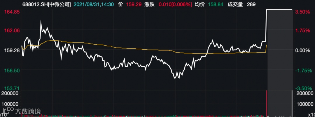 中微公司股价尾盘直线拉升,收盘报164.85元,上涨3.5%。爱美客股价也是尾盘跳涨,收盘报587.01元,上涨3.16%。此外,沪硅产业-U、中国联通、中国宝安尾盘也出现明显异动拉升。
