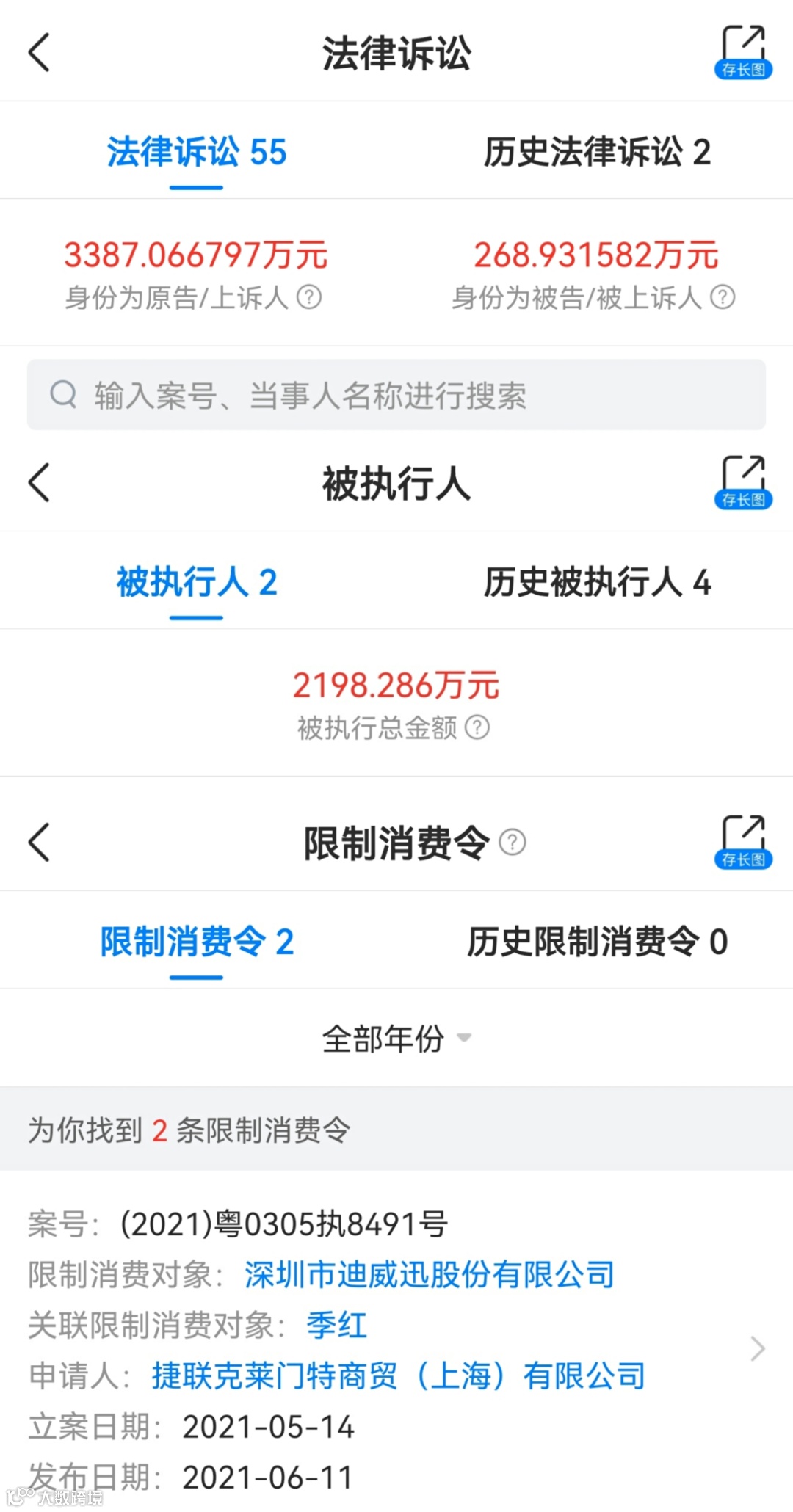 除了下滑的股价以及亏损的业绩,迪威迅还诉讼缠身。天眼查数据显示,公司涉及诉讼有55起,其中作为上诉人涉及资金为3387.07万元;身为被告涉及金额为268.93万元。与此同时,公司作为被执行人的执行总金额为2198.29万元。另外,公司还收到了两个限制消费令,最新一个的发布日期为2021年6月。