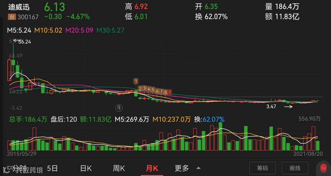 彼时,迪威迅也曾有过高光时刻。公司股价曾于2015年冲至高点56.24元/股,市值超150亿元。但随着公司业绩年年走下坡路,股价也一路下行。截至8月20日收盘,公司股价报6.13元/股,市值仅剩18.4亿元。