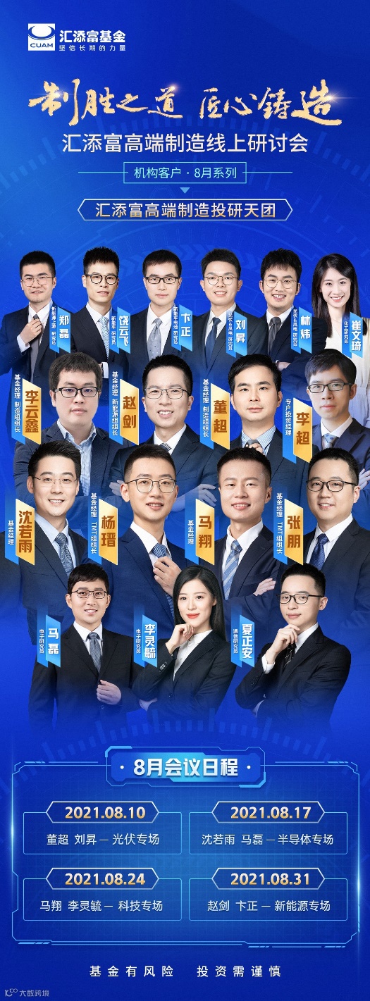 值此先进制造浪潮加速之际,以新能源、光伏、电动车、半导体等高端制造领域为代表的制造业具备非常好的发展趋势,也是当前资本市场的重要投资主线。此次举办8月系列高端制造线上研讨会,汇添富基金致力于在思想交锋和业务交流中,为投资者提供深刻的市场洞见和专业的投资建议,也希望与投资者们继续携手共进,筑梦未来。