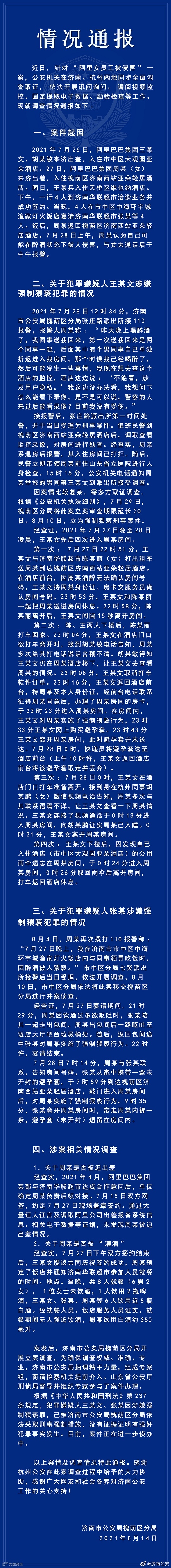 济南市公安局槐荫区分局在通报中表示,近日,针对“阿里女员工被侵害”一案,公安机关在济南、杭州两地同步全面调查取证,依法开展讯问询问、调阅视频监控、固定提取电子数据、勘验检查等工作。