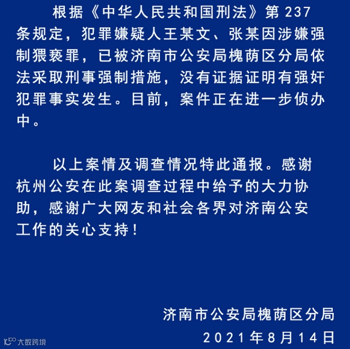 8月14日晚间,济南公安发布情况通报:犯罪嫌疑人王某文、张某因涉嫌强制猥亵罪,已被济南市公安局槐荫区分局依法采取刑事强制措施,没有证据证明有强奸犯罪事实发生。