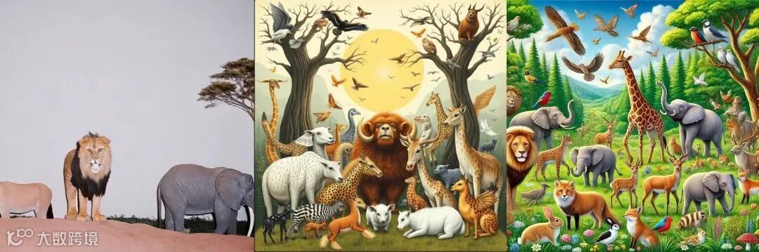 Recraft AI中内置的“Hard Flash”预设风格是此次走红的关键所在。这种模式模拟胶片摄影开启闪光灯后的拍摄效果,生成的图片主体突出、对比度高、色彩饱满浓郁,让生成的图片呈现出一种别样的质感。尽管当下有不少AI工具能生成画风细腻、精美的图片,但往往会带有一种“AI味儿”,或是色彩过渡不和谐、结构不自然,或是过于平滑、毫无瑕疵而显得失真。而Recraft AI的“Hard Flash”风格有着强烈且鲜明的视觉风格,使其在一众工具中显得与众不同。比如用不同模型输入“many animals”口令,Recraft内置的该模式会将动物一字排开,画面中土地与天空的大面积留白营造出独特情绪,仿佛在诉说着故事,甚至被贴上“梦核”“怪诞”的标签,极大地激发了网友们的创作欲。