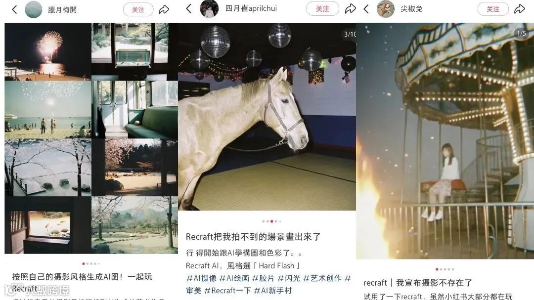 回顾AI生成图像领域的发展历程,近3年各大玩家竞争激烈,不断更新大模型。从DALL-E到Midjourney,从Stable Diffusion到FLUX,再到如今备受瞩目的Recraft AI,我们可以看到产品出圈不仅需要强大的模型实力,更要懂得吸引用户注意力。像妙鸭相机的“AI写真”、Remini的“黏土特效”,都是凭借独特功能在用户心中留下深刻印记。Recraft AI的“Hard Flash”风格同样成为它在社交媒体出圈、被大众认知的有力“抓手”,既加深了用户记忆,又巧妙掩盖了部分能力欠缺之处,让那些看似不合理的画面在独特风格标签下变得合理起来。