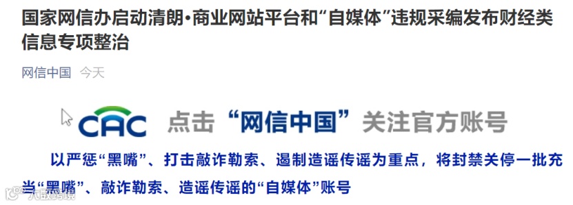 国家网信办官微“网信中国”8月27日消息,国家网信办决定自8月27日起开展清朗·商业网站平台和“自媒体”违规采编发布财经类信息专项整治。