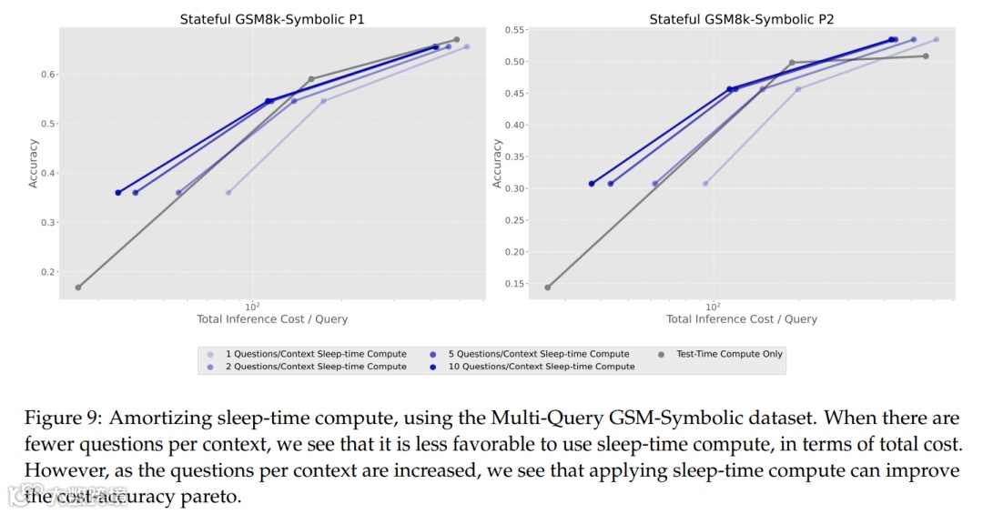 为了探究睡眠时计算的优势,研究人员进行了一系列实验。实验结果表明,睡眠时间计算能够改变测试时计算与准确率之间的帕累托边界,添加睡眠时间计算可以超越帕累托计算 - 准确率曲线。扩展睡眠时间计算会使帕累托曲线外移,在相似的测试时间预算下,性能提升最高可达 18%。在每个上下文有多个查询的设置中,应用睡眠时间计算使每个查询的平均成本降低多达 2.5 倍。而且,当问题能够通过上下文预测时,睡眠时计算最能发挥其优势,随着问题从上下文中变得更加可预测,睡眠时间计算和标准测试时间计算之间的准确度差距不断扩大。