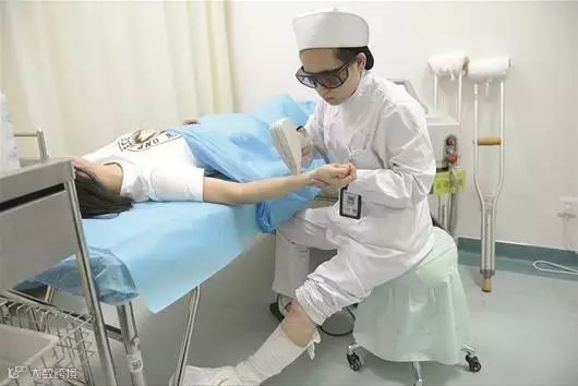 武汉市中心医院25岁的护士徐露,驾着双拐在科室奔走,打着石膏为患者做治疗。