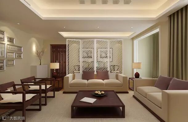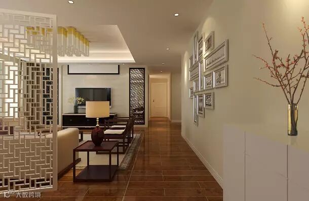 白色镂空隔断将客厅与玄关隔断开来,让玄关形成一个独立的个体,不规则排列的照片墙搭配着新中式经典的自然情趣元素。