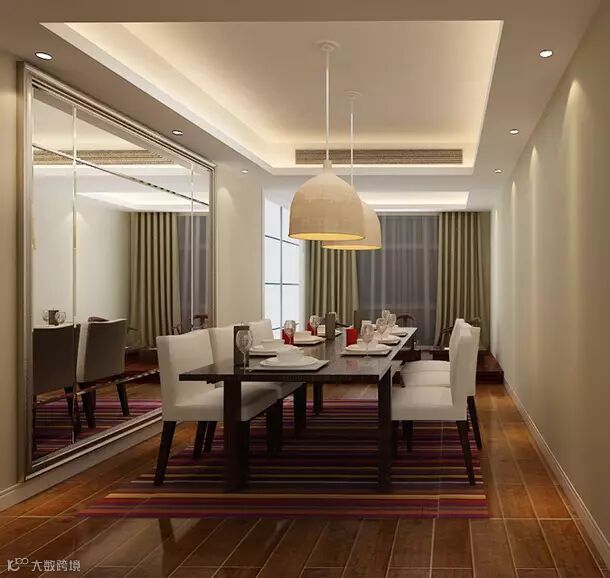 距离恰到好处的吊灯,在达到照明效果的同时,也不会让进餐的人觉得刺眼。镜面装饰让餐厅空间显得更加开阔明亮。
