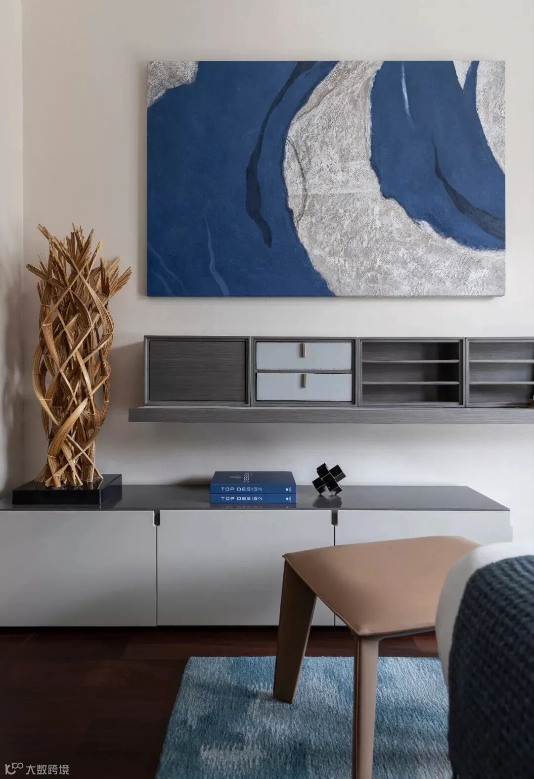 床尾的矮柜+悬空柜组合,墙上挂一幅灰蓝色配的装饰画,搭配一张皮艺的休闲凳,带来一种实用优雅而安静舒适的空间氛围。