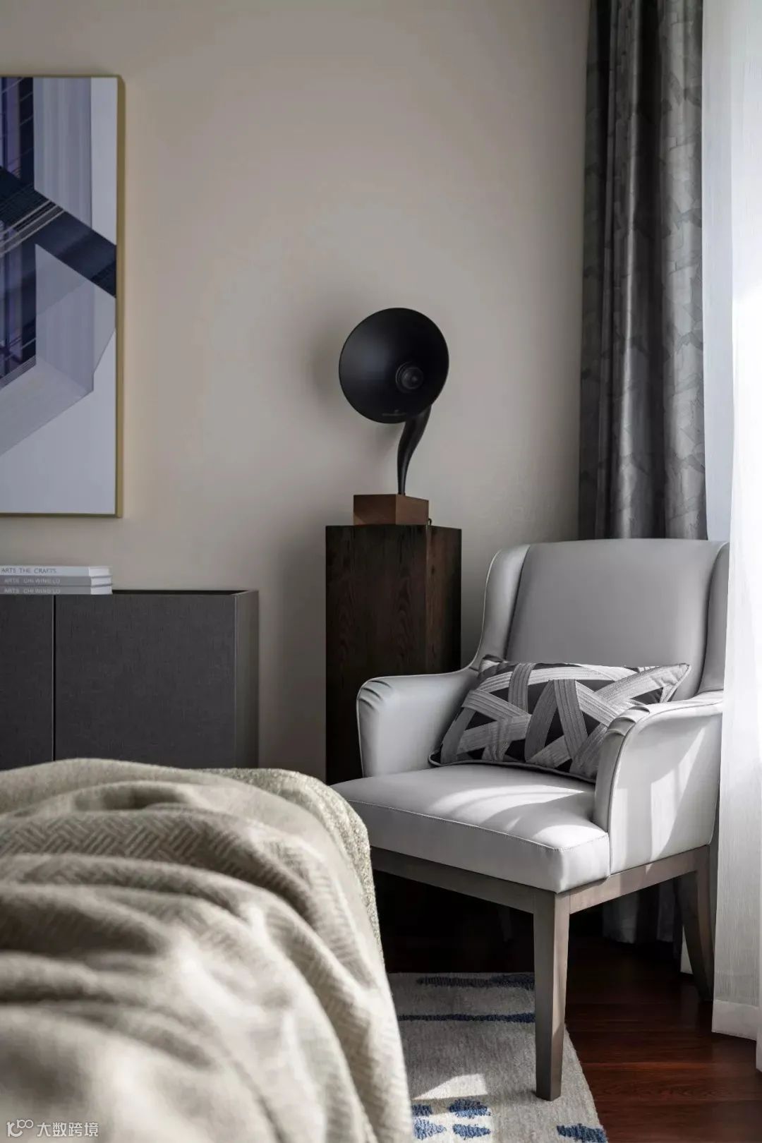 床尾不是斗柜,墙面上挂上黑白色的装饰画,布置休闲沙发椅,木质感的小柱子上摆上留声机,坐在沙发椅上休闲之时,听听音乐也是一种别样的舒适情趣。