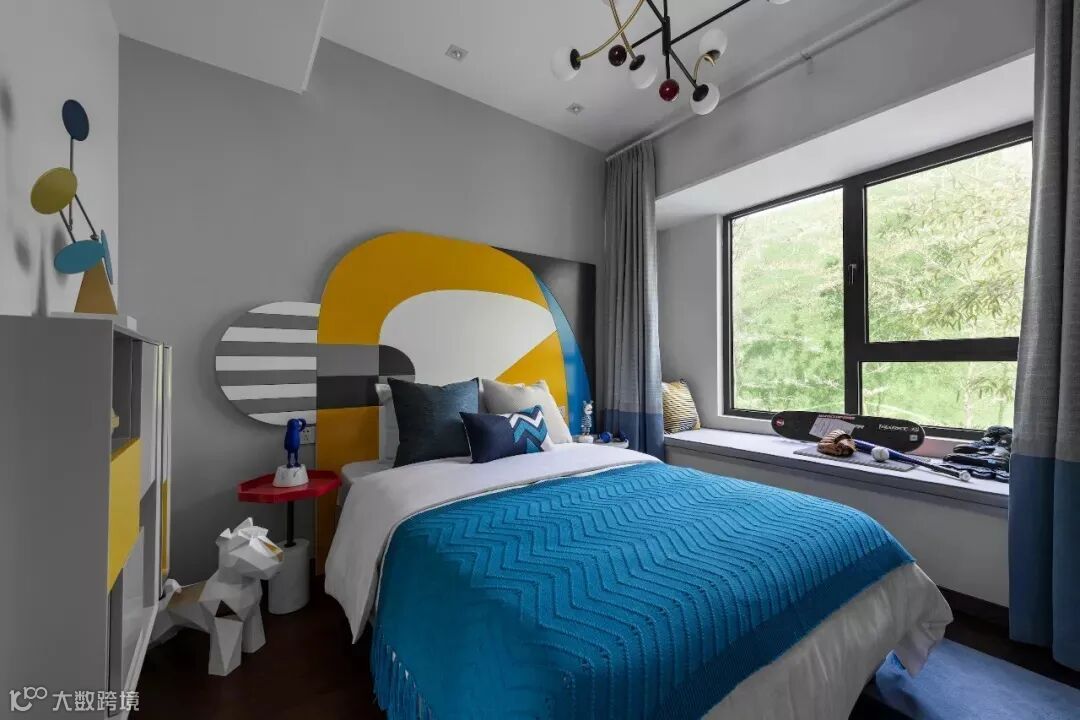 儿童房以灰色的床头墙+白色墙体空间,儿童床以颜色鲜艳的靠背设计,布置蓝白配的床单,让空间显得童趣活泼而又安静优雅。侧边一个小书柜,布置可爱的小摆饰品,整个空间显得可爱而又童趣。
