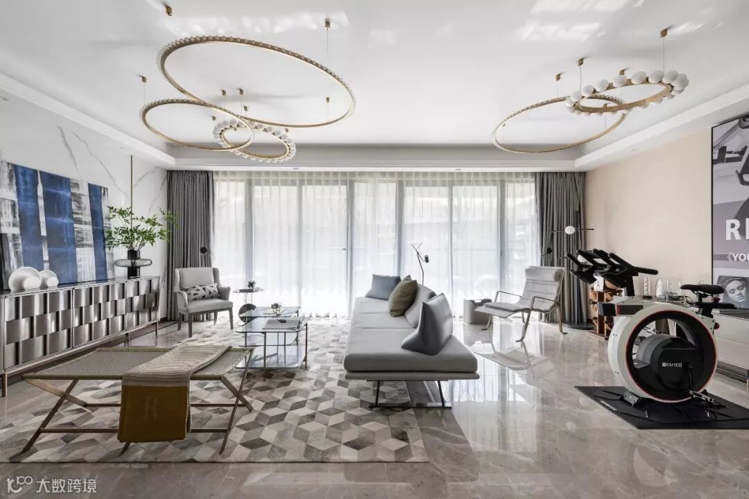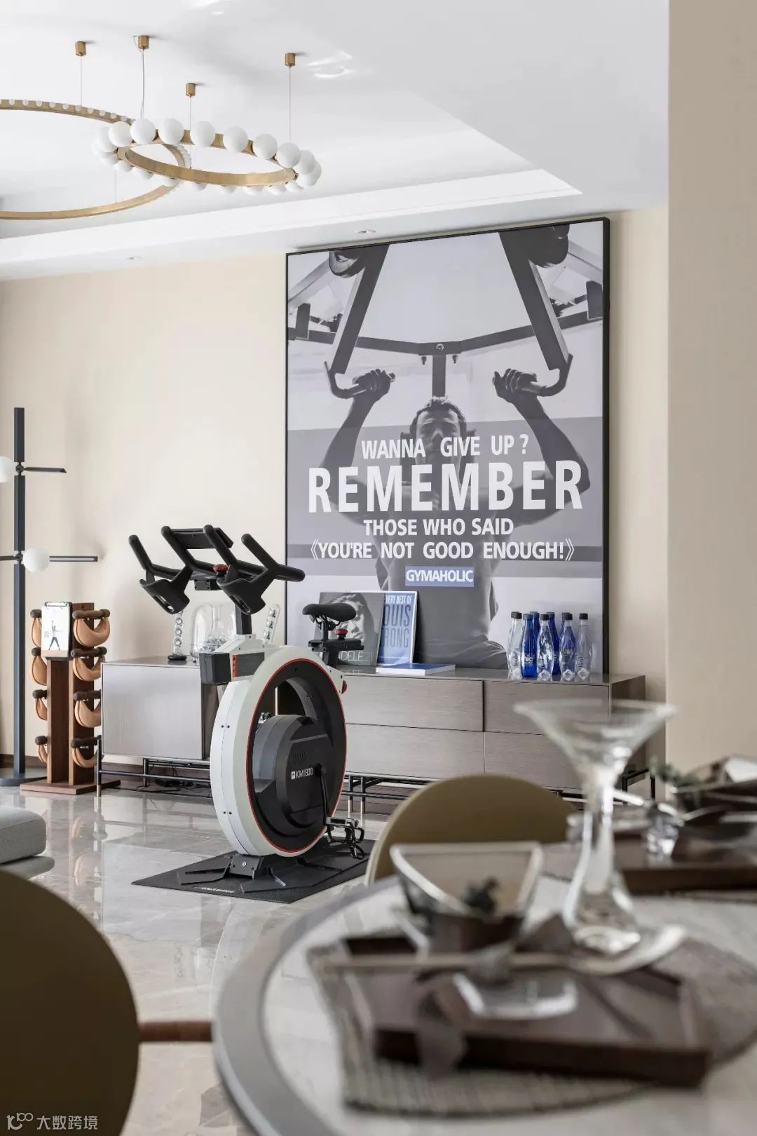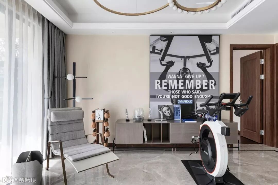 客厅沙发后布置休闲沙发椅、动感单车,把空间布置成休闲与运动的场所;后方靠墙布置一个矮柜,布置黑白色的的运动人物图案装饰画,也让空间显得更加时尚高级。