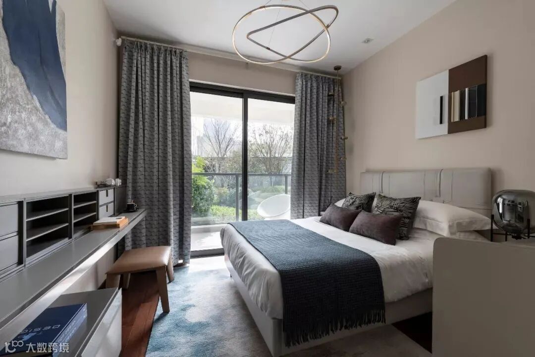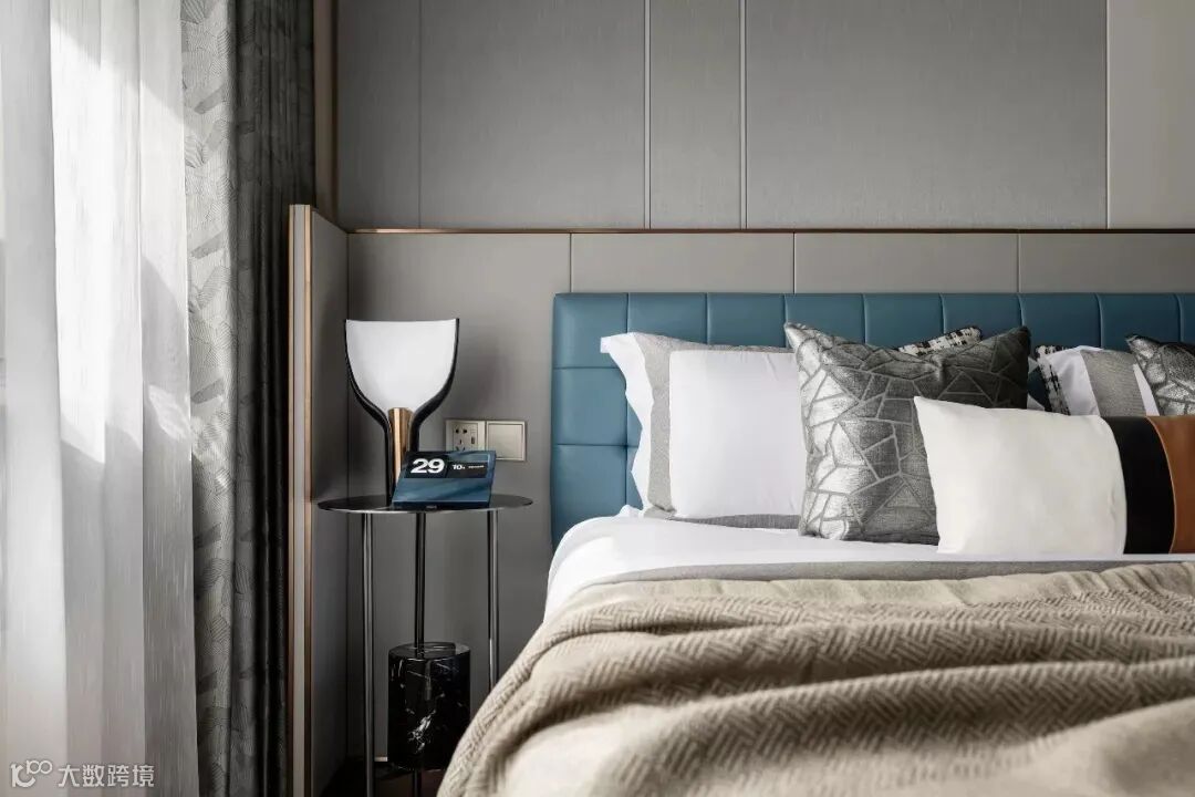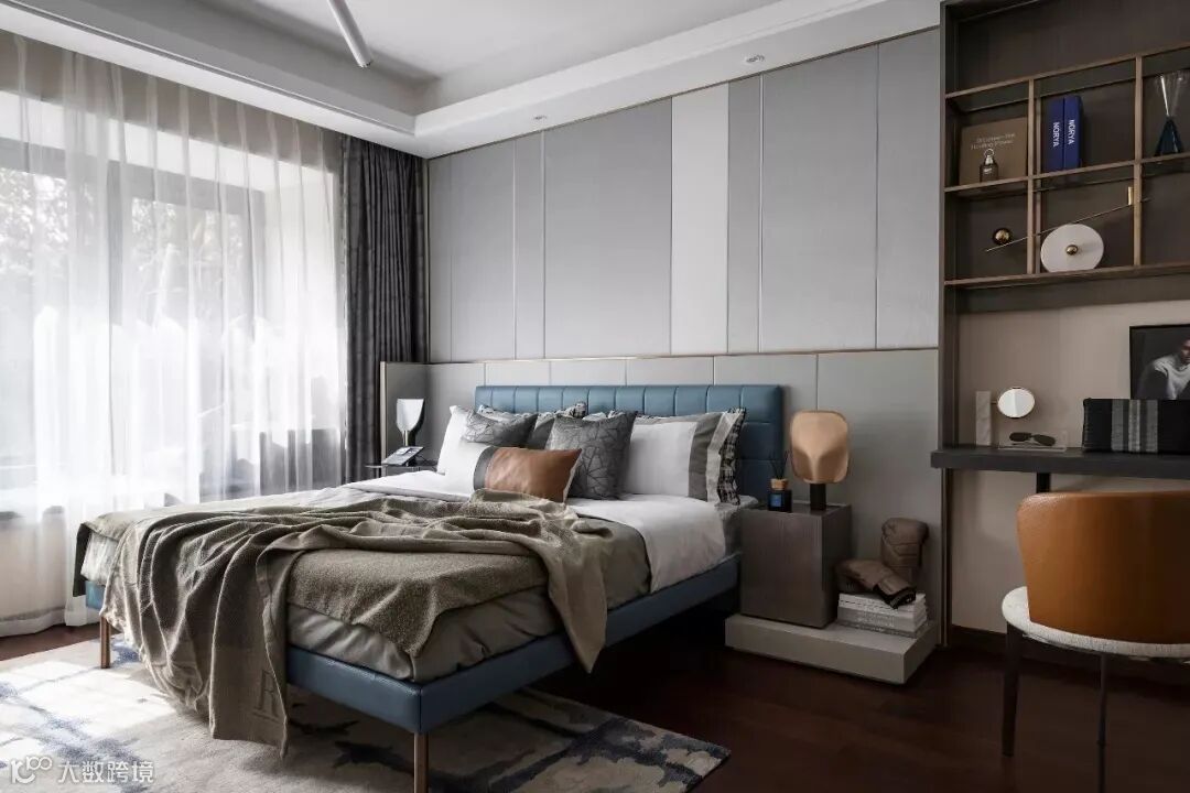 卧室床头墙是灰色硬包+软包墙脚的组合,布置蓝色皮艺床,布置军绿色与白色床单、灰白配的枕头,旁边定制一个书桌椅组合,布置艺术摆饰品,让空间显得充满高级优雅的舒适感。