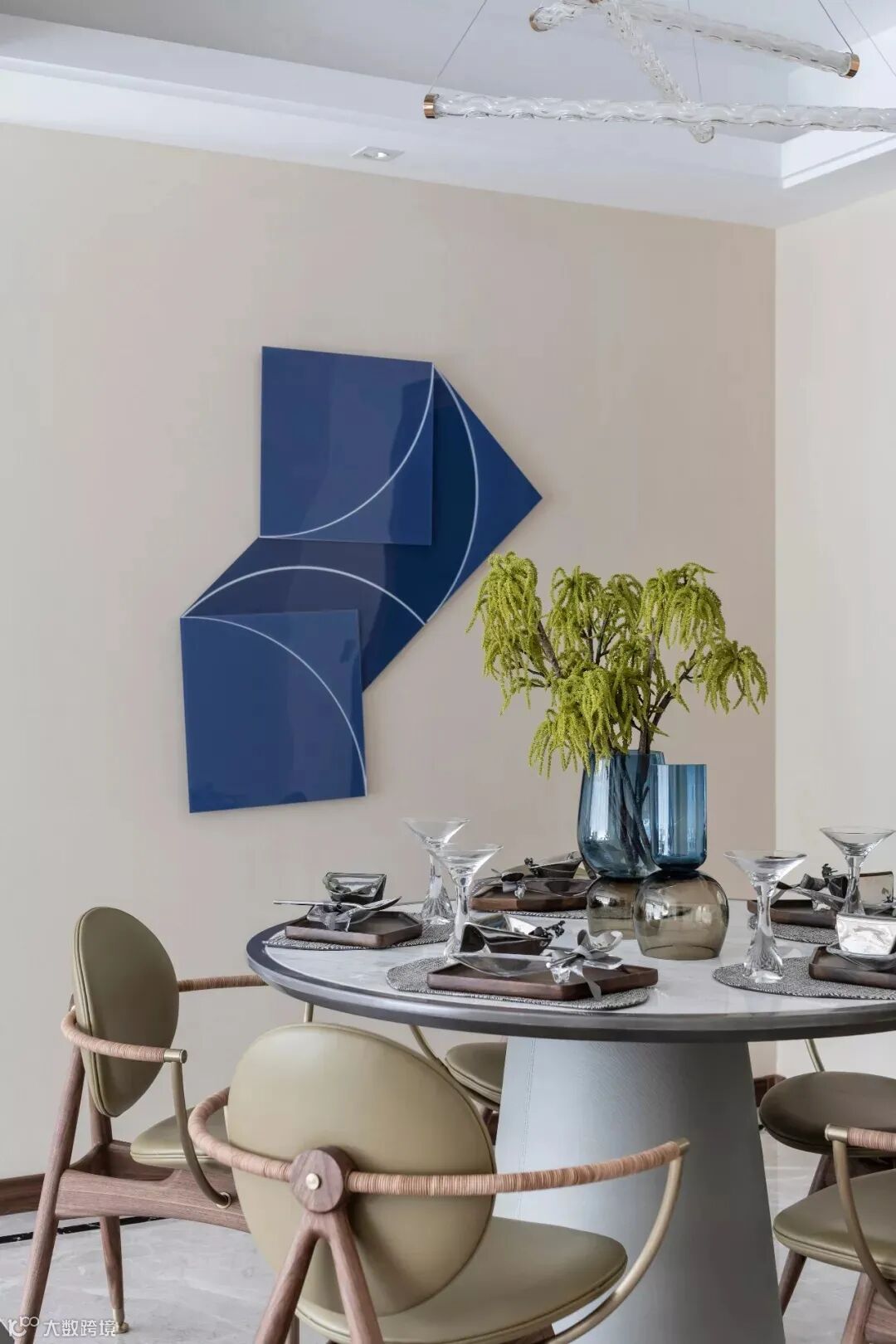 餐厅卡其色的墙面上挂上一幅蓝色不规则的装饰画,圆形的餐桌上布置餐具、酒瓶与蓝色玻璃花瓶,搭配实木架+绿色皮艺坐垫的餐椅,让用餐空间文雅精致而又高级情趣。
